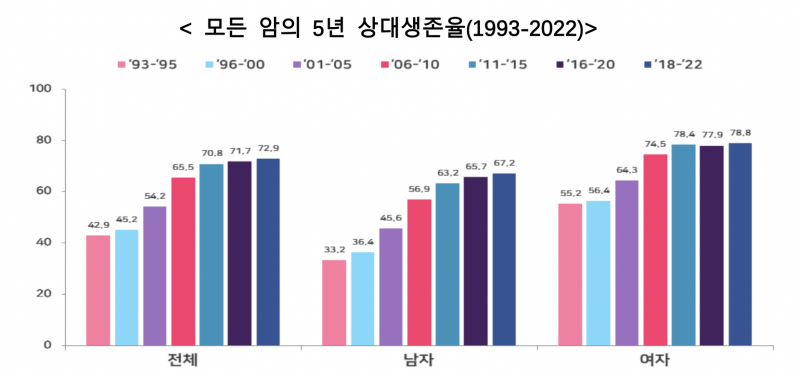 최근 5년간(2018~2022) 진단받은 암환자의 5년 상대생존율은 72.9%로, 암환자 10명 중 7명은 5년 이상 생존했다.