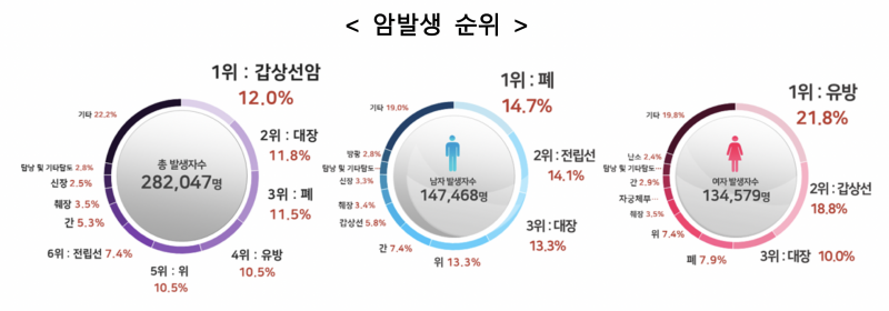 2022년 가장 많이 발생한 암은 갑상선암이며, 이어 대장암, 폐암, 유방암, 위암, 전립선암 순이었다. 국내 암환자 5년 생존율은 72.9%로 전국민의 5%가 암유병자인 것으로 확인됐다.