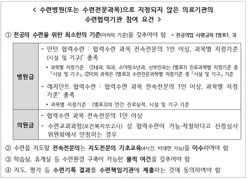 전공의 수련을 위한 최소한의 기준은 병원급 의료기관의 경우 협력수련 과목 전속전문의 1인 이상, 과목별 지정기준을 충족해야 한다.