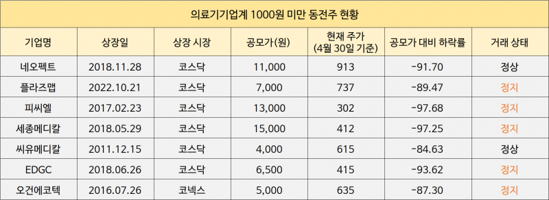 이 밖에도 씨유메디칼, EDGC(이원다이애그노믹스), 오건에코텍 등 상장 의료기기 업체들이 잇따라 동전주로 전락하며 시장 우려를 사고 있다.