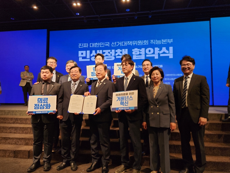 박명하 의협 부회장은 지난 8일 이재명 대선 후보와 더불어민주당 중앙선대위원회 직능본부가 개최한 제1차 먹사니즘 민생정책 협약식에 참석해 보건의료 관련 정책 협약을 체결했다.