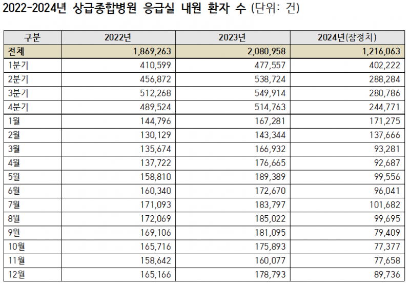 의정갈등이 촉발된 지난해 상급종합병원 응급실 내원 환자 수가 전년 대비 반토막이 난 것으로 나타났다. 응급실 재실 시간은 2시간 이상 단축됐다.