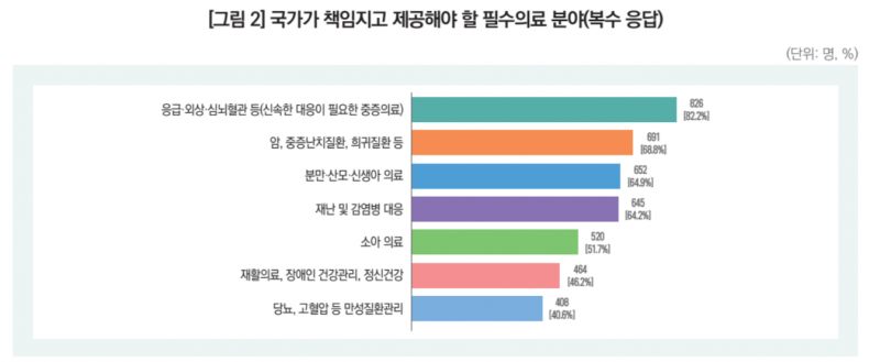 국가가 책임지고 제공해야 한다고 평가한 필수의료 분야(복수 응답)에서는 현재 정부 정책 우선순위와 유사한 경향이 나타났다.