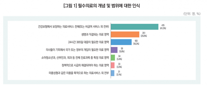 반면 41.3%는 필수의료를 ‘건강보험이 보장하는 의료서비스 전체(또는 비급여를 제외한 대부분의 서비스)’로 인식, 건강보험 보장과 필수의료를 동일시하는 포괄적 관점을 보였다.