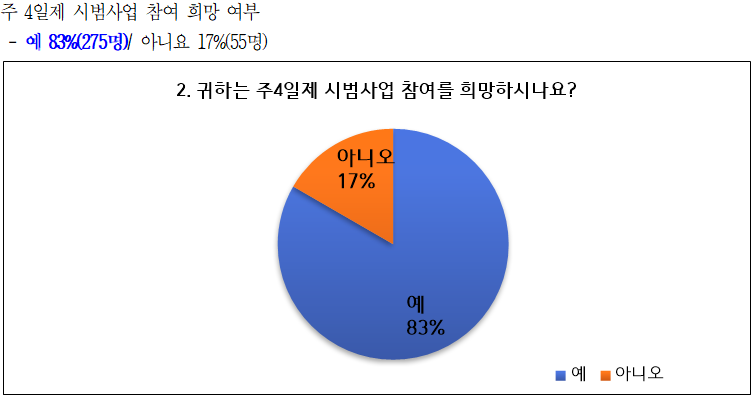 같은 기간 시범사업에 참여하지 않은 주5일 근무자의 응답 결과와도 비교된다. 조사에 응한 시범사업 비참여자(5월 38명, 8월 55명)의 1년 내 이·퇴직 의향은 16.7%에서 18.3%로 높아졌다. 이들의 자긍심은 7.42점에서 6.65점으로, 동기부여는 7.47점에서 6.69점으로 감소했다.