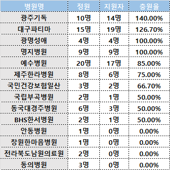 대구·경북 지역의 대구파티마병원 역시 15명 정원에 19명으로 126.7%의 충원율을 기록, 광명성애병원과 명지병원 또한 각각 4명, 9명의 정원을 모두 채우며 충원율 100%를 기록했다.