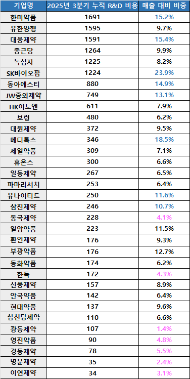 데일리메디가 국내 주요 제약사 33곳의 올해 3분기 누적 R&D 투자비용을 취합한 결과, 한미약품·유한양행·대웅제약·종근당 순으로 가장 많은 금액을 투자하고 있는 것으로 나타났다.
