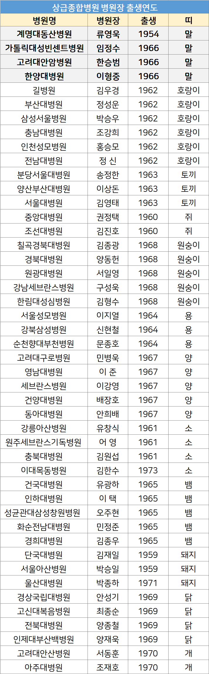 호랑이띠는 김우경 가천대 길병원장, 박승우 삼성서울병원장, 조강희 충남대병원장, 정성운 부산대병원장, 홍승모 인천성모병원장, 정신 전남대병원장이 있다.