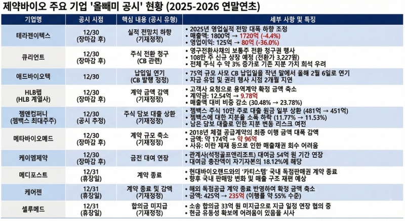 제약바이오 기업들도 상황은 마찬가지다. 메디포스트, HLB펩 등 13곳의 제약바이오 기업이 주요 내용을 각각 폐장일 공시하거나 장마감 이후 정정공시 한 것으로 나타났다.