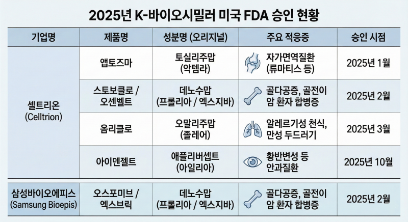 2025년에는 셀트리온과 삼성바이오에피스가 미국 FDA 승인을 잇따라 확보하며 한국 바이오시밀러의 존재감을 재확인했다.