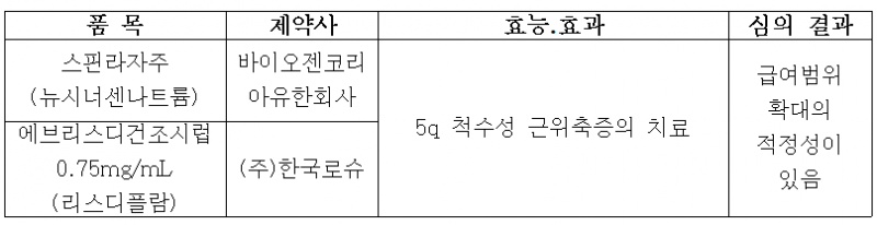 이와 함께 동일 질환 치료제인 한국로슈 '에브리스디건조시럽0.75mg/mL(리스디플람)' 역시 급여범위 확대 적정성을 인정받았다.
