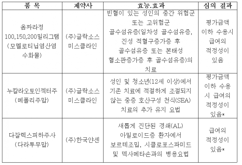 결정신청 약제의 요양급여 적정성 심의에서는 3개 품목이 테이블에 올랐다.