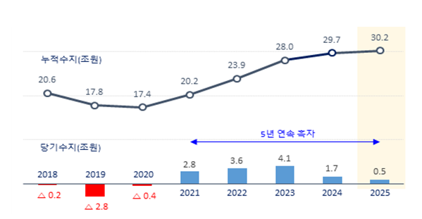 다만 흑자폭은 뚜렷한 감소세를 보였다. 당기수지는 2023년 4조1000억원, 2024년 1조7000억원에서 지난해 4996억원으로 가파르게 줄어들었다.