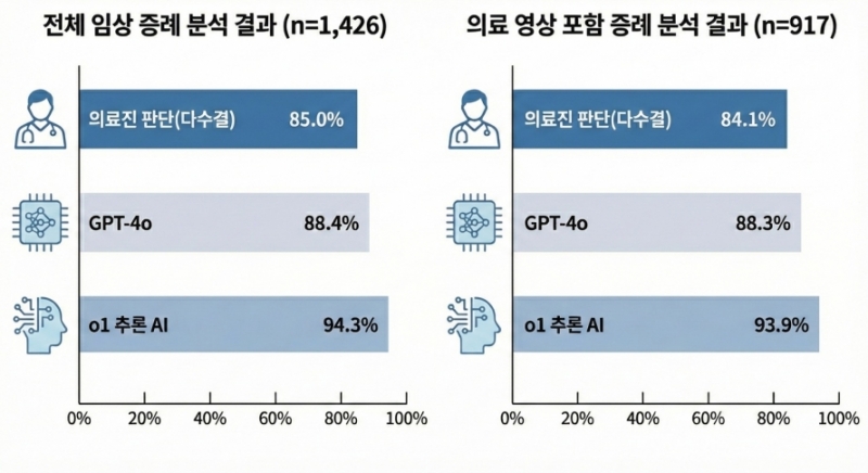 분석 결과, 다수 의료진이 선택한 답안 정확도는 85.0%였고 GPT-4o는 88.4%, 최신 추론 모델인 o1은 94.3%를 기록했다. 의료영상이 포함된 증례만을 별도로 분석한 경우에도 두 모델 모두 유의미하게 의료진보다 높은 정확도를 보였다.