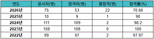 외과, 산부인과, 안과, 심장혈관흉부외과, 신경외과 등 16개 과목은 응시자 전원이 합격해 합격률 100%를 기록했다. 응시자가 493명으로 가장 많았던 내과 역시 98.37%의 높은 합격률을 보였다.