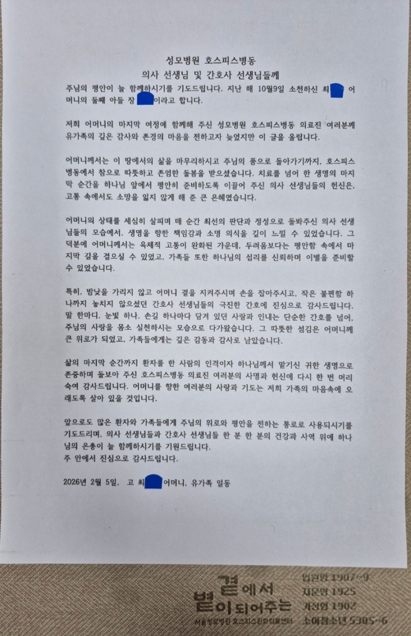 유가족은 편지를 통해 "어머니께서는 호스피스병동에서 참으로 따뜻하고 존엄한 돌봄을 받으셨다"며 "의사 선생님들의 세심한 판단과 정성 어린 돌봄 덕분에 육체적 고통이 완화된 가운데 평안함 속에서 마지막 길을 걸으실 수 있었다"고 회고했다.