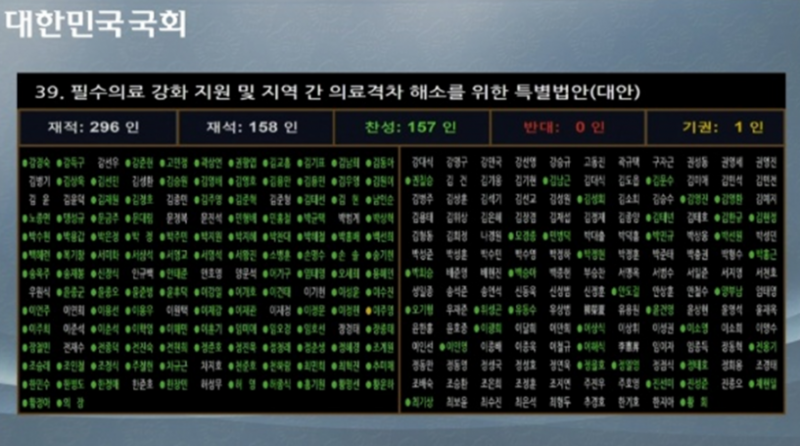 국회는 12일 오후 본회의를 열고 필수의료특별법을 의결했으며, 재석 158인 중 찬성 157인, 반대 0인, 기권 1인 등으로 가결됐다. 의사 출신 개혁신당 이주영 의원은 유일하게 기권표를 던졌다.