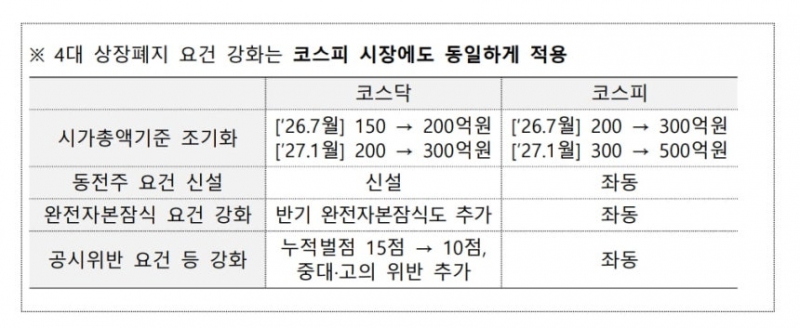 금융위원회는 지난 2월 12일 '부실기업 신속·엄정 퇴출을 위한 상장폐지 개혁 방안'을 발표하고 시가총액 요건 상향, 동전주(1000원 미만) 상장폐지 규정 신설, 반기 기준 완전자본잠식 적용, 공시위반 요건 강화 등을 추진한다고 밝혔다.