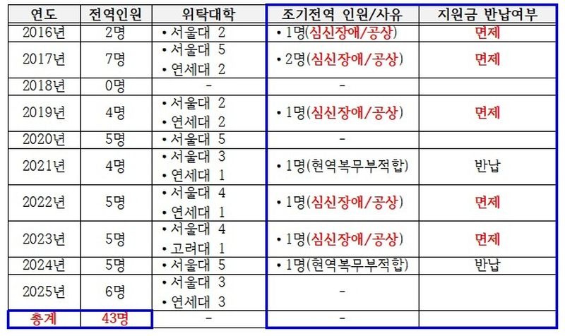 국회 국방위원회 유용원 의원(국민의힘)이 국방부로부터 제출받은 ‘의대 위탁교육 제도로 양성된 군의관 전역 현황’에 따르면 최근 10년간 전역 인원(43명) 중 8명이 조기 전역했다.