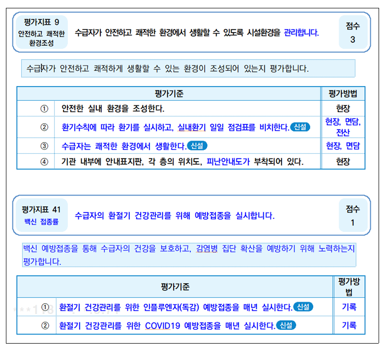 환기설비 운영 여부와 자연환기 횟수 등 환기상태 확인 항목을 세분화해 시설 환경관리를 체계화했다. 아울러 수급자의 환절기 예방접종 지표를 도입하고, 결핵 검진을 포함한 건강진단을 실시해 관리체계를 한층 강화했다.