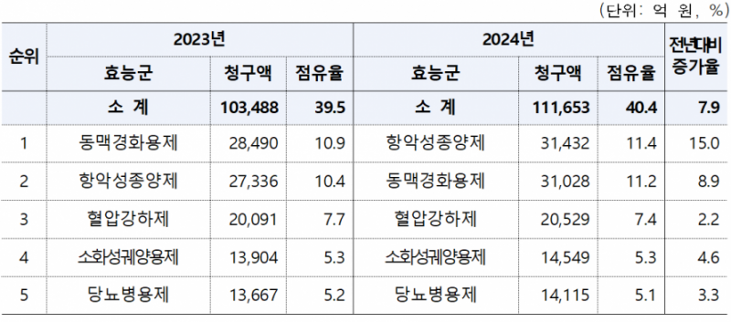 개별 성분별로는 고지혈증 치료제인 ‘에제티미브+로수바스타틴’ 복합제가 7046억원의 청구액을 기록하며 전년 대비 16.3%의 높은 성장률로 1위를 고수했다.
