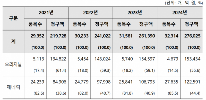 지난해 오리지널 의약품 지출액은 15조3434억원(55.6%)으로 여전히 과반을 차지했으나, 제네릭 의약품 지출액이 12조 2591억원(44.4%)까지 올라오며 매년 청구액 비중이 꾸준히 증가하는 추세다.