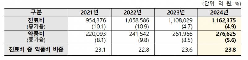 같은 기간 전체 진료비 증가율인 4.9%를 상회하면서, 진료비 대비 약품비 비중 역시 전년(23.6%)보다 0.2%p 상승한 23.8%를 기록했다.