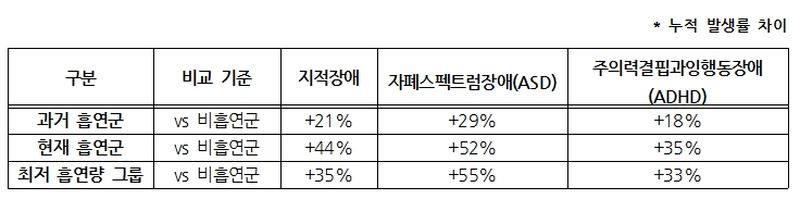 현재 흡연그룹 자녀는 지적장애 44%, 자폐스펙트럼장애 52%, 주의력결핍과잉행동장애의 경우 35% 높은 것으로 조사됐다.