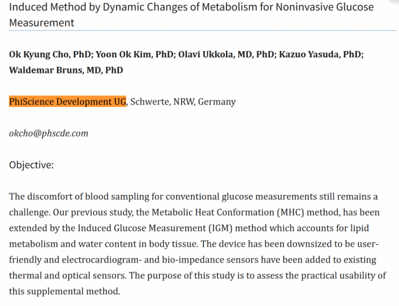 국제 학술 데이터베이스에 등재된 2010년 발표 논문에 따르면, 독일 소재 소규모 연구개발 법인인 Phiscience Development UG는 비침습 혈당측정과 관련된 연구에 공동 참여한 이력이 있다.