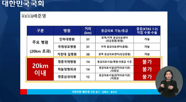 그에 따르면 영종 지역 20km 이내 있는 영종국제병원·하늘정형외과·영종삼성의원 등은 중증(KTAS 1·2)으로 분류되는 환자를 직접 수용하거나 수술하는 것이 불가능하다. 수용·수술이 가능한 인하대병원·국제성모병원·가천대 길병원은 20km 이상 떨어져 있다.