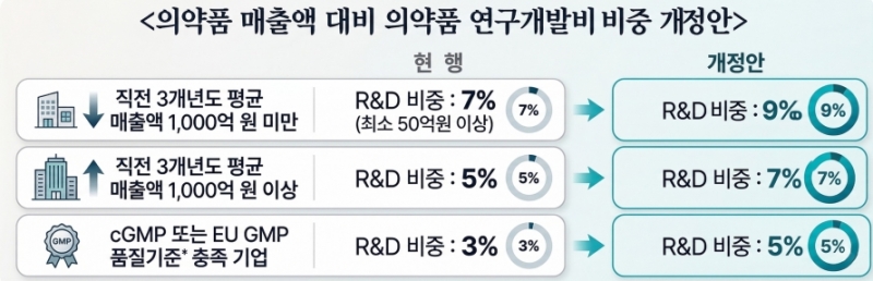 우선 직전 3개년도 평균 매출 1000억원 미만 기업의 경우 의약품 매출 대비 R&D 비중 기준을 7%에서 9%로, 1000억원 이상 기업은 5%에서 7%로, cGMP 또는 EU GMP 품질기준 충족 기업은 3%에서 5%로 상향했다.