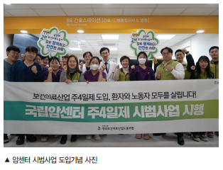 지난해 12월에는 국립암센터가 8B병동 교대 간호사 5명을 대상으로 6개월간 주4일 근무를 시행한다고 밝혔다.