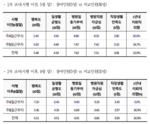 또 참여 병동에서 병가를 낸 비율은 2021년~2022년 3.05일에서 2023년~2024년 2.2일로 줄었지만, 미참여 병동은 같은 기간 내 2.8일에서 3.5일로 증가하는 등 차이를 보였다.