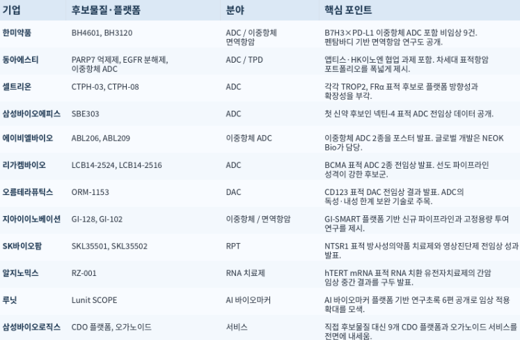 발표 주제는 ADC(항체-약물 접합체), DAC(분해제-항체 접합체), 이중항체·면역항암, 유전자·mRNA·RNA 기반 치료제, AI 바이오마커·정밀진단 등 다변화하는 양상이다.