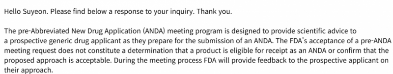 이 같은 설명은 Pre-ANDA 미팅 수락 자체를 ‘제네릭 경로 인정’이나 ‘허가 가능성 확인’으로 해석하는 것은 적절하지 않다는 점을 분명히 한 것으로 풀이된다.