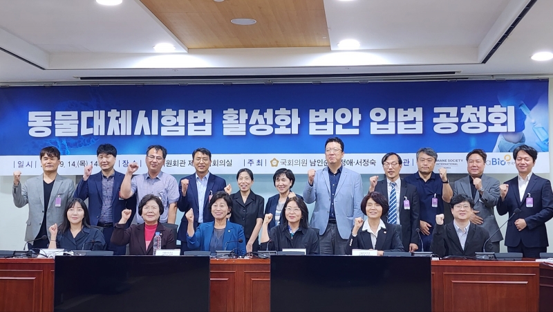 14일 남인순, 한정애, 서정숙 의원이 주최하고 한국 휴메인 소사이어티 인터내셔널, 한국바이오협회가 주관한 동물대체시험법활성화 법안 입법 공청회가 국회에서 진행됐다.