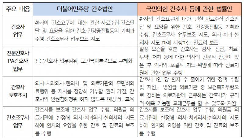 강선우 의원안은 '의사와 의료기관이 시키는 무면허의료행위 거부권'을 명시했고, 추경호 의원안은 간호사 1인 당 환자 수를 줄이기 위한 정책 수립, 규칙적인 교대근무 지원 등을 담았다.