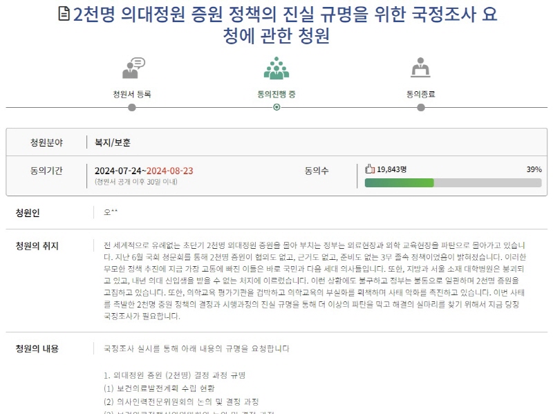 전의교협 측은 청원 취지에 대해 "세계적으로 유례없는 초단기 2000명 의대정원 증원을 몰아붙이는 정부는 의료현장과 의학 교육 현장을 파탄으로 몰아가고 있다"며 "지난 6월 국회 청문회를 통해 2000명 증원이 협의도 없고, 근거도 없고, 준비도 없는 3무(無) 졸속 정책이었음이 밝혀졌다"고 주장했다.