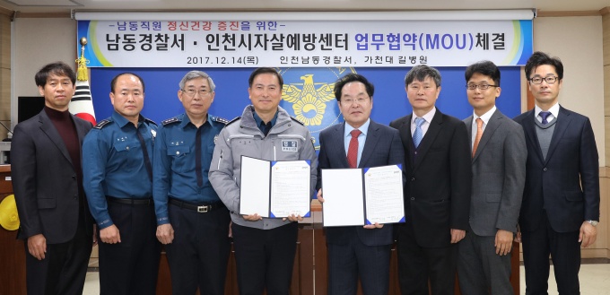 가천대 길병원(병원장 이근)은 14일 인천남동경찰서(서장 이상훈)와 남동경찰서에서 경찰관 정신건강증진을 위한 협약을 체결했다고 15일 밝혔다. 양 기관은 경찰관의 정신건강증진을 위해 정신건강 교육 및 자살예방 상담 등에 있어 상호 적극 협조하기로 약속했다. 또 치료가 필요한 동료 경찰관을 발견, 치료를 받을 수 있도록 조언할 수 있는 내용의 교육도 시행하기로 했다.