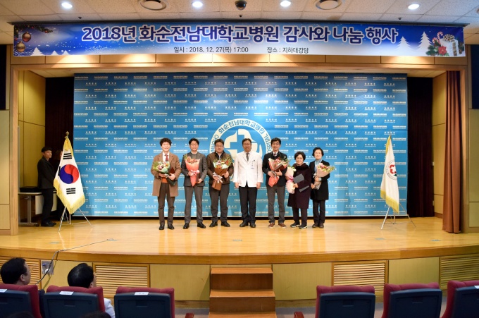 화순전남대학교병원(원장 정신)은 최근 대강당에서 2018년을 마무리하는 ‘감사와 나눔잔치’를 열었다. 임직원들은 “환자중심 글로벌 암특화병원으로서 더욱 탄탄한 기반을 닦은 한해였다. 세계 일류병원으로 도약하기 위해 더욱 힘을 모으자”고 의지를 다졌다.