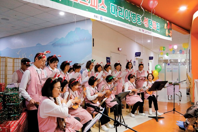 가톨릭관동대 국제성모병원(김영인 병원장)은 최근 호스피스완화의료병동에 입원해 있는 환자와 보호자들을 위한 성탄·연말 파티를 열었다. 국제성모병원은 연말을 맞아 말기 암 환자와 보호자에게 위로와 격려를 보내기 위해 이번 행사를 마련했다. 병원 호스피스팀은 한 해 동안 환자와 함께한 영상을 제작해 선보였다. 또 호스피스 자원봉사자들은 크로마하프와 우크렐라를 연주하고 캐럴송을 부르며 추억을 선물했다.