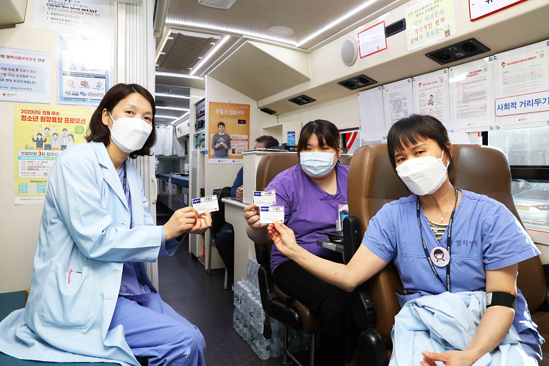 병원 앞마당에 주차된 대한적십자사 헌혈차량을 찾아 헌혈에 동참했다.