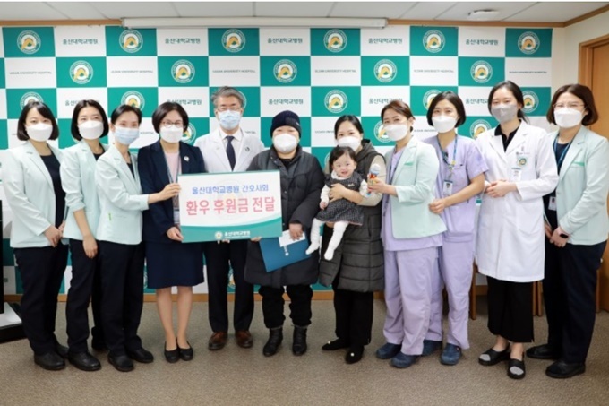 울산대학교병원 간호사회는 21일 치료비가 필요한 환자와 생계비 지원이 필요한 소아환우를 위한 후원금을 전달했다. 울산대학교병원에서 열린 후원금 전달식에는 울산대학교병원 정융기 병원장, 김정미 간호본부장과 서인진 간호사회 회장, 간호사회 관계자들이 모여 진행했다.