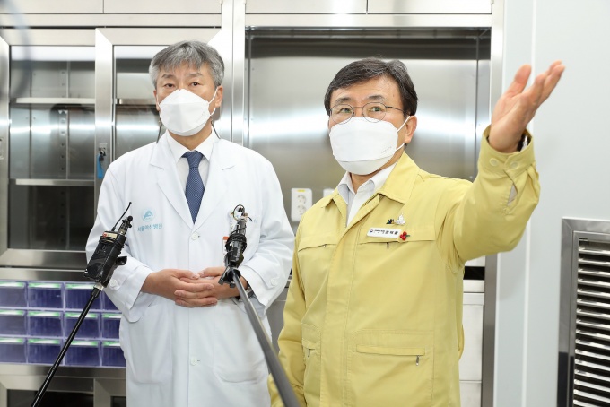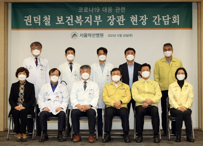 권덕철 보건복지부 장관(중앙재난안전대책본부 제1차장)이 30일 오전 10시 코로나19 중증환자 전담치료 병상을 운영 중인 서울아산병원을 찾아 의료진을 격려했다. 이날 권덕철 장관은 서울아산병원 박승일 원장 등과의 간담회를 통해 그간 코로나19 대응에 따른 노고에 대해 감사를 표했다. 또 중증환자 전담치료 병상 운영 관련 건의사항 등을 청취했다.