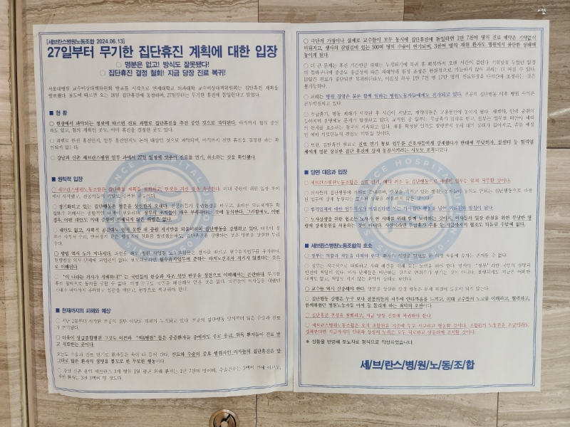 연세의료원 산하 세브란스병원, 강남세브란스병원, 용인세브란스병원 교수들이 6월 27일부터 무기한 휴진에 돌입했다. 세브란스병원 노조도 대자보를 통해 “집단휴진 결정을 철회하고 당장 진료에 복귀해야 한다. 집단휴진을 강행하는 것은 도가 지나치다”고 주장하면서 정상진료를 요구했다.