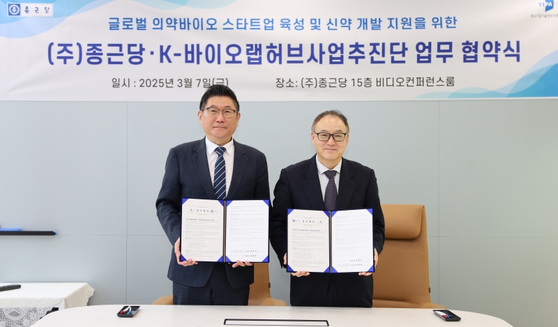 중소기업기술정보진흥원 K-바이오랩허브사업추진단(단장 한인석)과 종근당(대표이사 김영주)은 7일 종근당 본사에서 창업기업 발굴 및 육성을 위한 업무협약을 체결했다. 주요 내용은 ▲혁신 바이오기업 발굴 및 육성 ▲신약 개발을 위한 공동 R&D 연구 협력 지원 ▲개방형 혁신 촉진을 위한 프로그램 공동 기획이다. 김영주 종근당 대표이사는 “혁신적인 바이오 창업기업들이 글로벌 무대에서 경쟁력을 갖출 수 있도록 지원할 것”이라며 “바이오 분야 발전을 위해 지속적으로 협력하겠다”고 말했다.