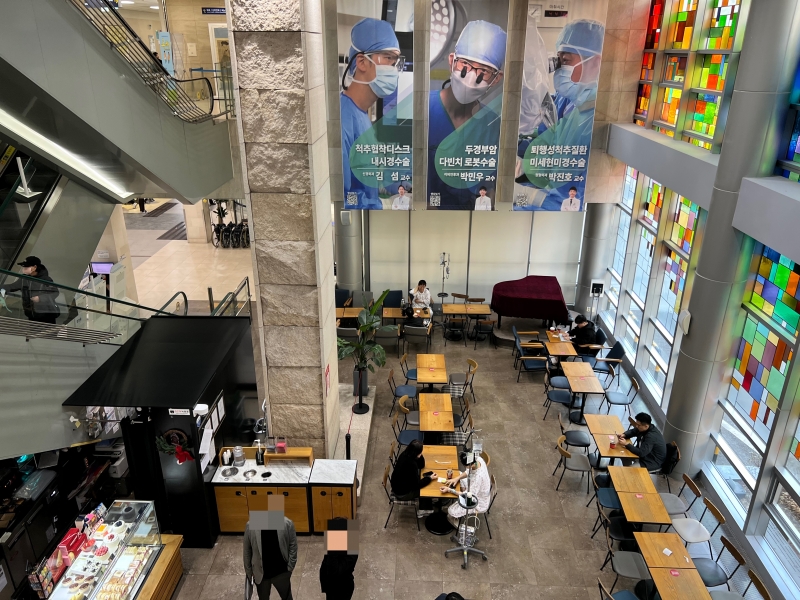 병원 곳곳에는 자동화 시스템이 도입돼 있다. 무인수납기와 접수·수납 키오스크가 운영 중이었으며, 안내 직원이 방문객 옆에 서서 기기 이용을 돕는 장면도 확인됐다. 대형 창문을 통해 자연광이 들어오는 휴게공간에는 카페가 마련돼 있고, 커피를 마시는 환자와 보호자들의 모습이 보였다.