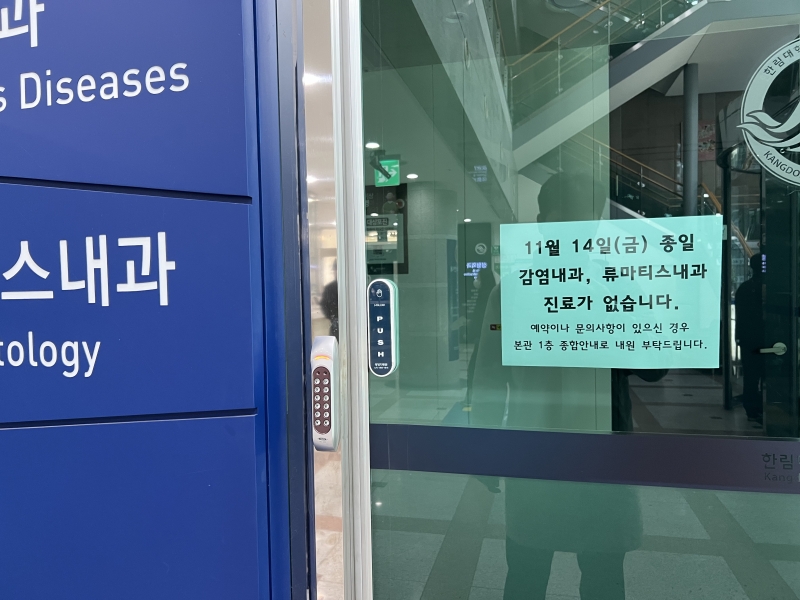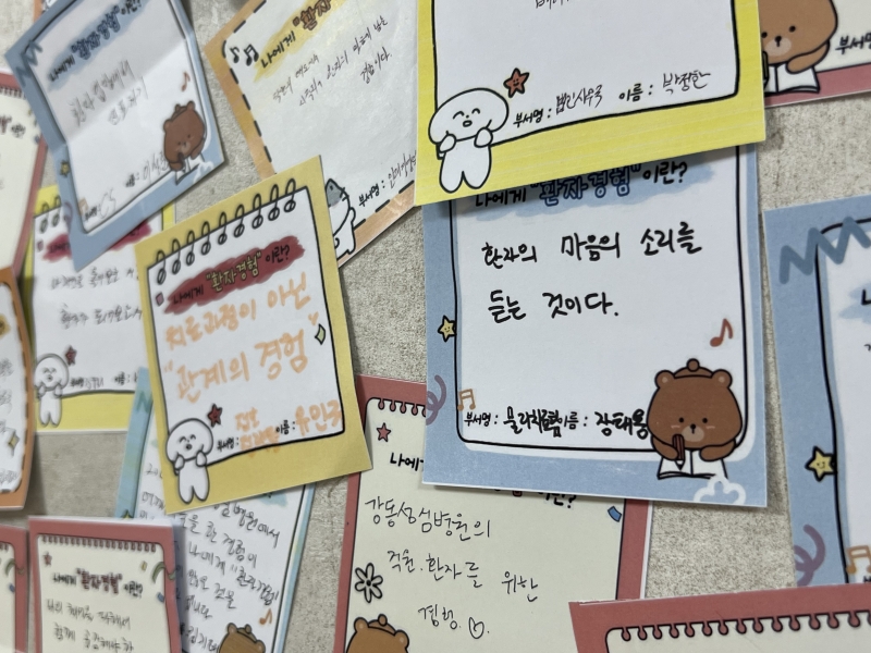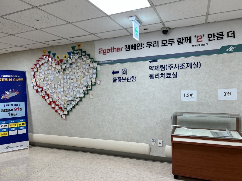웰빙센터에 들어서자 ‘감염내과·류마티스내과 금일 휴진’ 안내문이 가장 먼저 눈에 들어왔다. 일부 환자들은 안내데스크를 찾아 예약 변경 등을 문의하는 모습이었다. 한쪽 벽면에는 의료진이 직접 작성한 ‘환자 경험’ 메시지가 하트 모양으로 전시돼 있다. '환자 경험이란 치료 과정이 아닌 관계의 경험'이라는 문구가 눈에 띄었다.