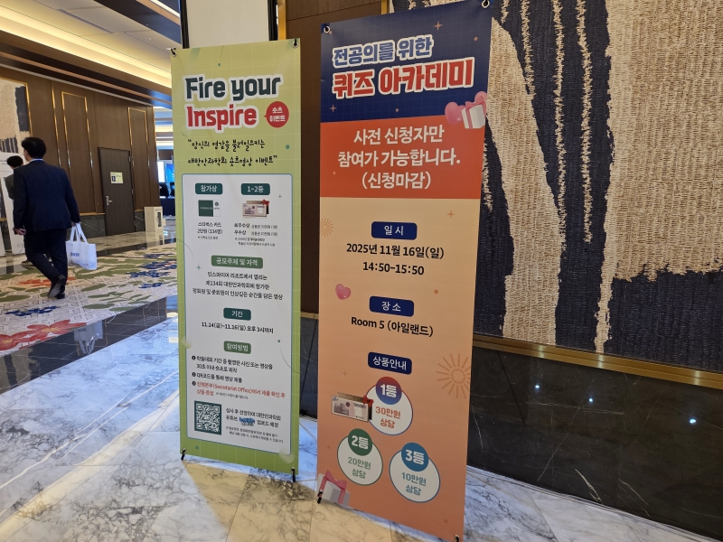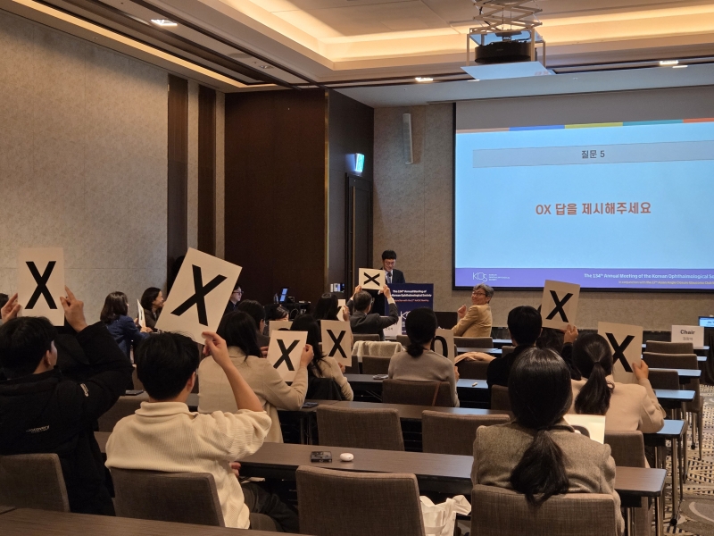 눈에 띄는 대목은 대다수 하반기에 복귀한 전공의를 위한 특별 행사다. 전공의를 위한 ‘슬기로운 안과의사 되기’ 세션 뿐 아니라 학술대회 기간 동안 ‘안과학회 숏츠영상 이벤트’를 열어 전공의 등이 학술대회 중 촬영한 사진·영상을 30초 이내로 제작해 제출하면 심사 후 안과학회 유튜브 채널에 업로드된다. 최우수 수상작에는 30만원의 상품권을 제공한다. 셋째 날 마지막 세션에도 1등에게는 30만원의 상품권을 제공하는 ‘전공의를 위한 퀴즈 아카데미’가 마련돼 열띤 참가율을 보였다. 행사는 필수 안과질환 진단·치료를 주제로 OX 퀴즈 형태로 진행됐으며, 김찬윤 이사장, 김홍균 학술이사, 김태임 총무이사 등 임원도 참석해 전공의들을 독려했다. 전공의들이 퀴즈를 잘 맞히자 임원들은 흐뭇한 미소를 지었다. 퀴즈 초반에는 모든 전공의가 통과했지만 난이도가 높은 문제가 출제되자 절반 이상이 탈락하며 행사장에는 아쉬운 목소리와 웃음소리가 퍼지기도 했다.