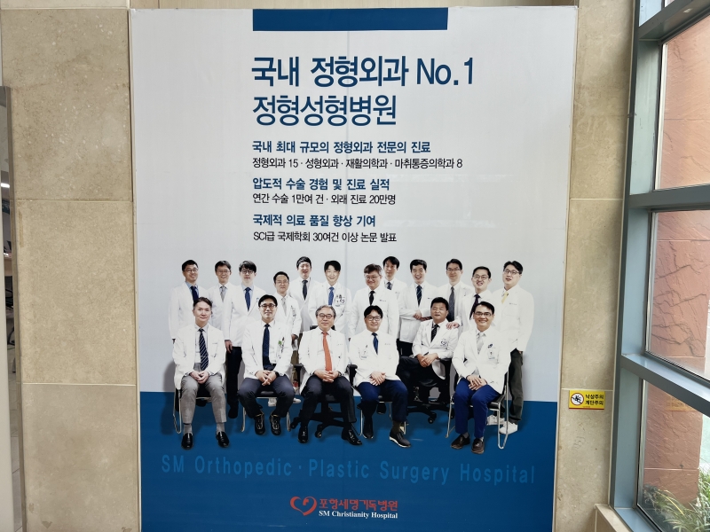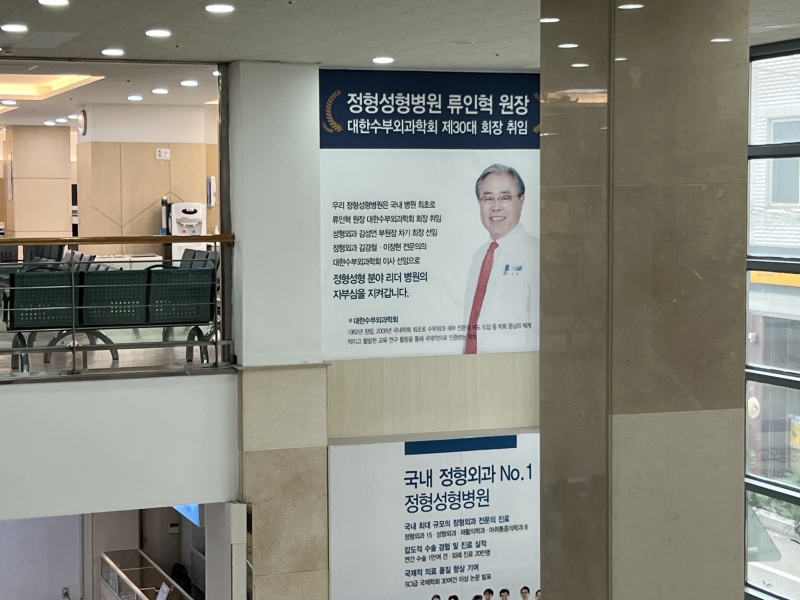 1층 복도에는 심장내과, 소화기내과, 내분비내과 등 세분화된 진료과별 전문의 안내판이 보기 쉽게 정리돼 있고, 금연지원서비스와 응급의료센터 운영 정보도 함께 배치돼 있다. 별관 정형성형병원에는 ‘국내 정형외과 No.1’을 내세운 대형 포스터가 부착돼 있으며, 류인혁 원장이 대한수부외과학회 회장을 역임하며 국제 학술 활동을 이어가고 있다는 설명이 병원의 전문성과 신뢰도를 높이고 있다.